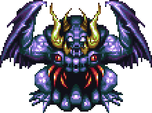 In his true form, Deathevan is a hideous blue-skinned demon with a strong resemblance to Myria, having multiple worm-like appendages beneath his legs, all of them with mouths. His two arms are large and end in wings, lacking proper hands or fingers. His torso features a second face with red eyes situated above an array of moving red teeth or tendrils. The second face's mouth conceals a hidden appendage that ends in an eyeball-like organ; it lashes outward with an array of tendrils as a basic physical attack. His true face is a rather conventional demon head featuring multiple golden horns and blank white eyes with no discernible iris or pupil. He has a very large tail that almost rivals the rest of his body mass; strangely, this does not appear on his overworld sprite.