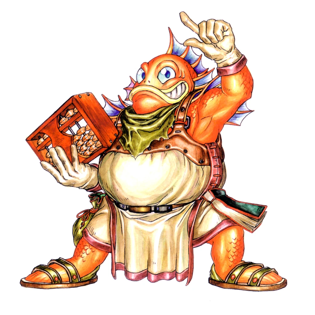 Gobi (known as Manillo in the original Japanese version) is a playable character that appears in Breath of Fire. He is an incredibly greedy merchant, and a member of the Manillo Clan. Underwater, Gobi can use his Sphere to transform into a Big Fish, allowing him to ferry the party across the sea.