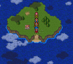 Points of interest include a hut inhabited by Bo and Karn from Breath of Fire, and a fishing spot in the north which holds a treasure chest containing a LoveBR, an accessory which gradually restores the HP of equipped characters while walking.
