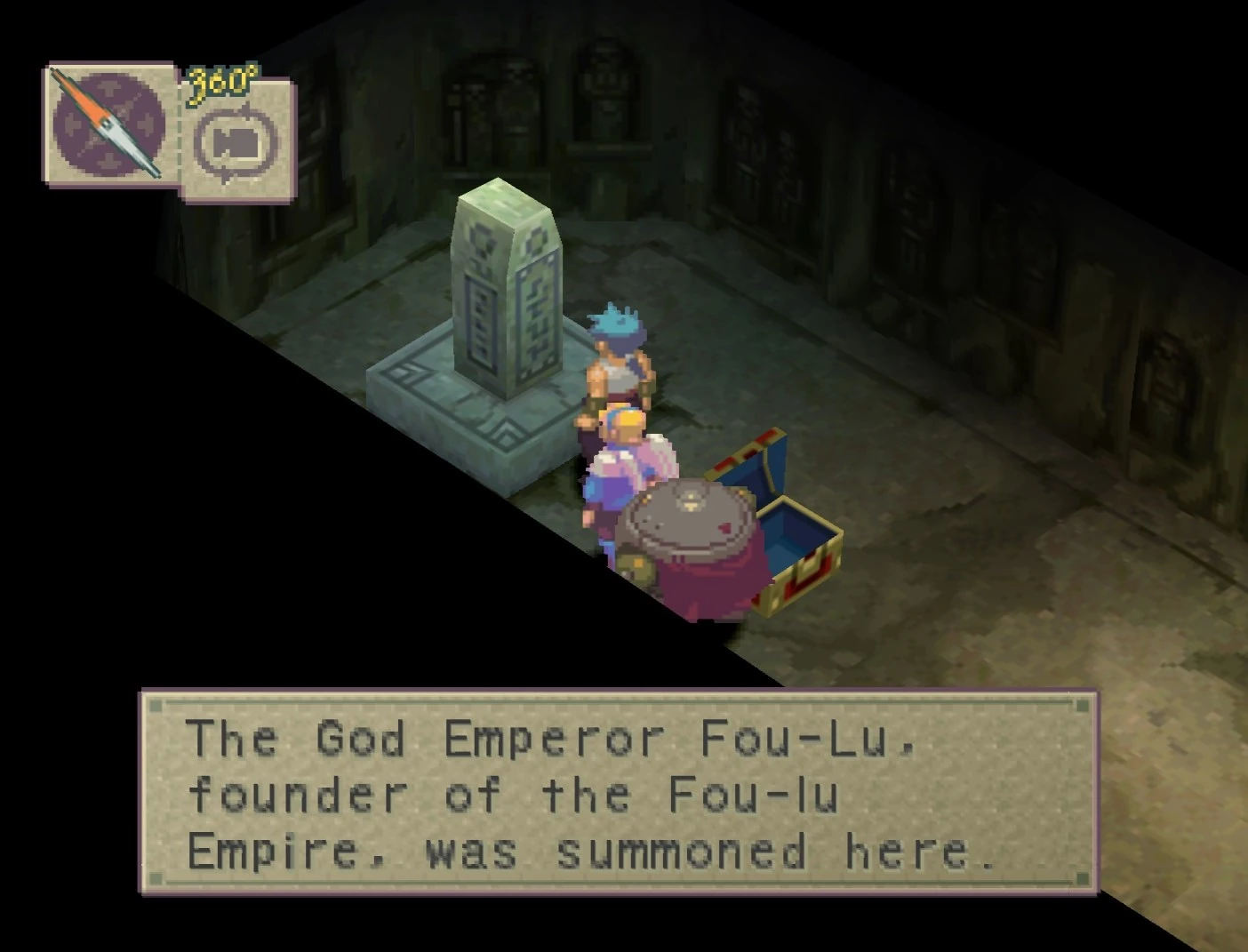At the end of the path, they reach a room with various stone statues inside as well as a protruding central pedestal which holds the fabled Dragon Tear. The pedestal's inscription reads that Fou-Lu, the god emperor who founded an entire empire, was summoned here centuries ago.